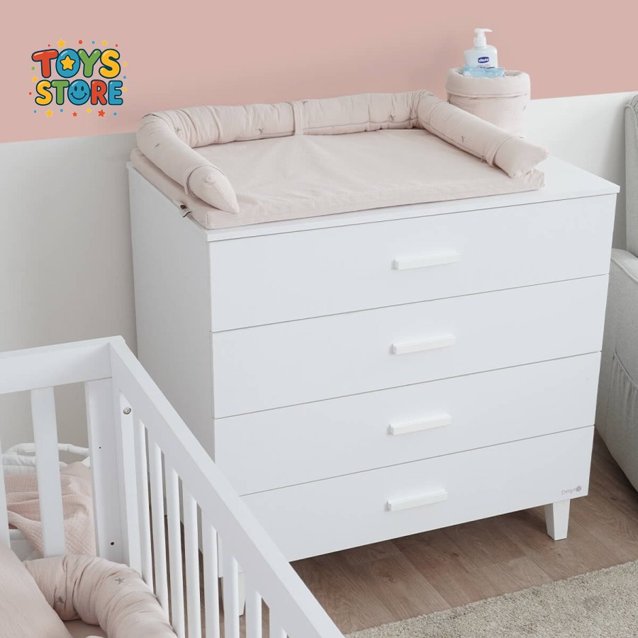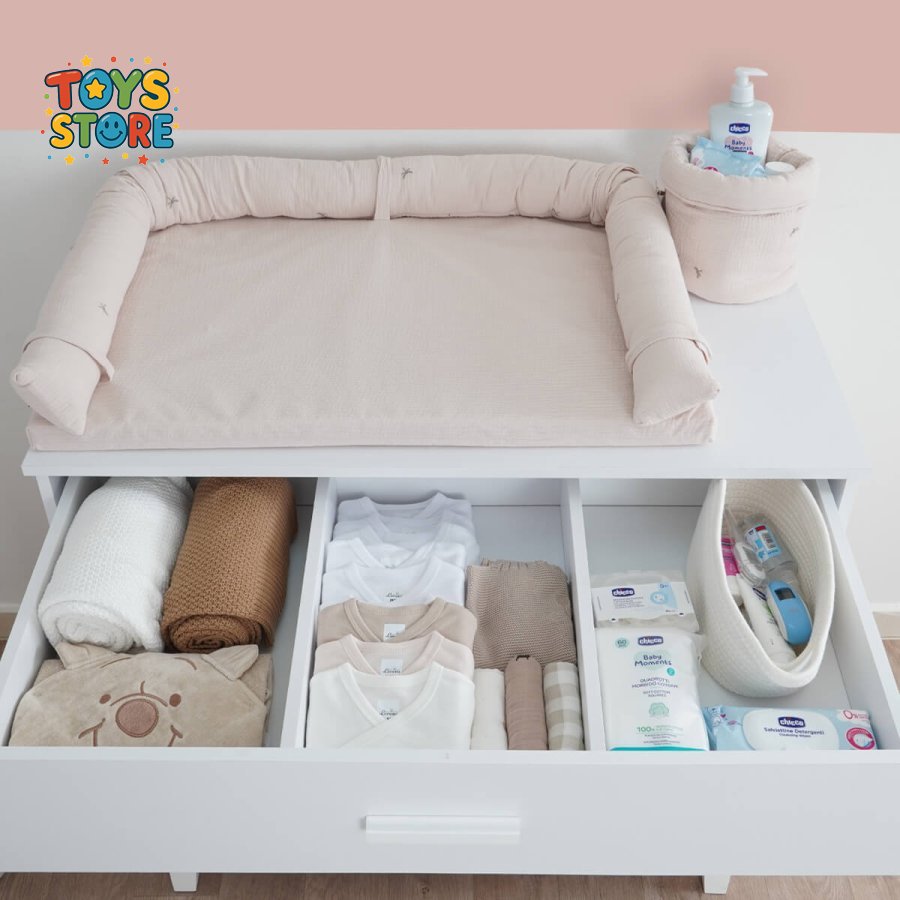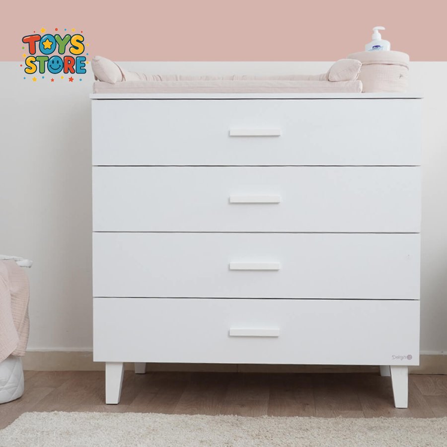 تحتوي خزانة الملابس على أربعة أدراج، كل درج مزود بمقبض خشبي. يحتوي الدرج العلوي على قسم داخلي. يُقسّم الدرج إلى ثلاثة أقسام، مما يوفر أقصى استفادة منه، وسهولة الوصول إلى كل غرض (يُنصح بتخزين الأغراض الأكثر استخدامًا في هذا الدرج، مثل: الحفاضات، والمناديل، واللهايات، والملابس، إلخ).