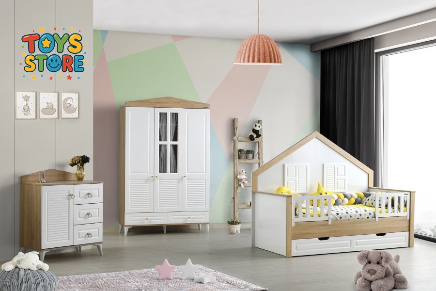 واجهات (أبواب) خزانة الملابس والخزانة مصنوعة من ألواح MDF، بينما الأجزاء الأخرى مصنوعة من ألواح خشب مضغوط. قضبان السرير المتحركة، وواجهة الدرج السفلي، والأجزاء البيضاء مصنوعة من ألواح MDF، بينما الأجزاء الأخرى مصنوعة من ألواح خشب مضغوط. الأدراج مزودة بقضبان قابلة للتمديد بالكامل.