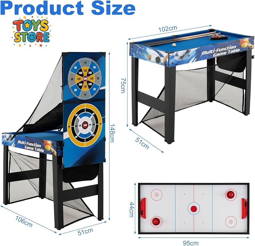 ملحقات كاملة: تأتي طاولة الرياضة متعددة الوظائف هذه مزودة بجميع المكونات اللازمة لتجربة لعب فورية وغامرة. من الكرات والمضارب إلى المضارب الخشبية والسهام، صُممت كل قطعة لتدوم طويلاً وتؤدي أداءً استثنائياً.